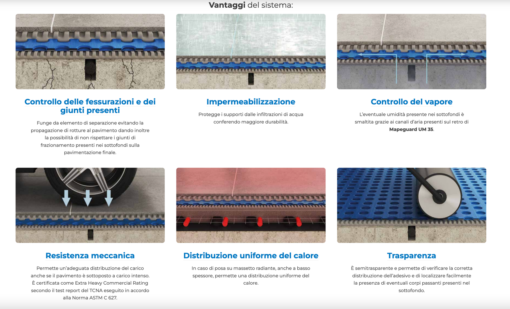 Distribuzione uniforme del calore Mapeguard UM 35 garantisce in caso di posa su massetto radiante, anche a basso spessore, una distribuzione più uniforme del calore.