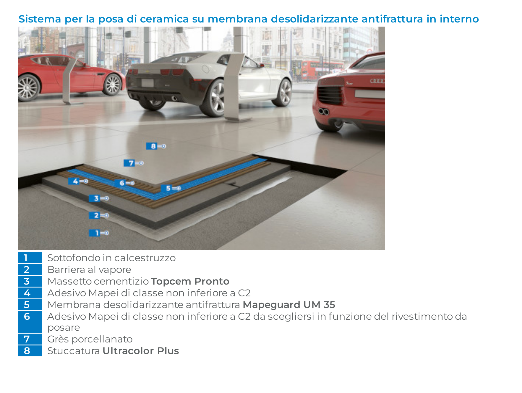 Membrana desolidarizzante, antifrattura, impermeabilizzante per supporti fessurati, umidi e/o non perfettamente stagionati, per la posa di piastrelle di ceramica e materiale lapideo a pavimento in interno ed esterno senza la necessità di rispettare i giunti di frazionamento esistenti. Mapei codice: 2850730