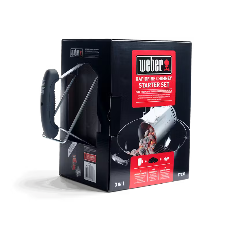 • Contiene 2 kg di bricchetti Weber®, 3 accendifuoco e la ciminiera d’accensione Weber®