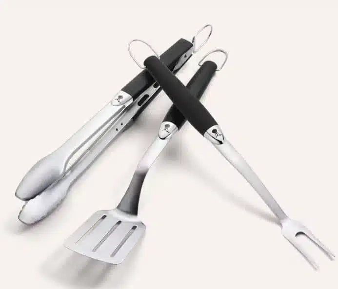 Gira gli hamburger e le salsicce o tieni ben ferma la tua punta di petto per affettarla uniformemente. La spatola angolata, le pinze bloccabili e la robusta forchetta del set di utensili Premium sono tre elementi essenziali per le grigliate di tutti i giorni, in un unico kit.