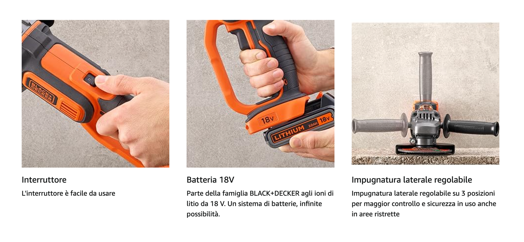 Questa smerigliatrice angolare a batteria ad alte prestazioni è perfetta per i progetti più impegnativi. Una smerigliatrice angolare agli ioni di litio BLACK+DECKER da 18 V fornisce la potenza, il numero di giri e l'autonomia della batteria necessari per svolgere qualsiasi attività di taglio, su piastrelle, metalli e plastica o attività di smerigliatura, come la rimozione della ruggine. Con maggiore comfort grazie alle 3 opzioni di posizione della maniglia e un interruttore più facile da usare in più posizioni, questa è la smerigliatrice angolare perfetta per i lavori più impegnativi. Parte della famiglia BLACK+DECKER agli ioni di litio da 18 V. Un sistema di batterie, infinite possibilità.