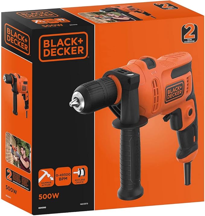 BLACK+DECKER Trapano elettrico a percussione da 500W, potente 0-32.300 BPM per muratura e calcestruzzo, design compatto con impugnatura laterale, BEH200-QS.