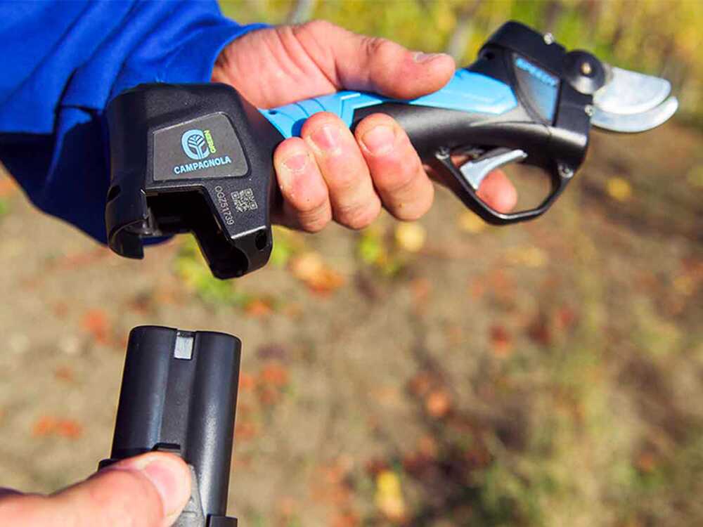Le forbici da potatura elettronica SPEEDY Campagnola hanno 2 batterie ai polimeri di litio da 2 Ah, compatta e con scocca leggera realizzata in resistente plastica.